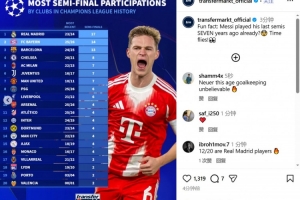拜仁历史上第14次进入欧冠4强,仅次于17次的皇马