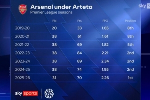 阿尔特塔执教森纳以来英超场均积分: