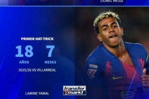 体育资讯3月3日讯 德国转会市场盘点了部分球星首次戴帽的年龄,姆巴佩17岁,亚马尔18岁,梅西19岁。