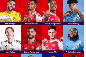 拉亚(阿森纳)、萨利巴(阿森纳)、加布里埃尔(阿森纳)、奥赖利(曼城)、哈里·威尔逊(富勒姆)、B费(曼联)、赖斯(阿森纳)、塞梅尼奥(伯恩茅斯/曼城)、伊戈尔·蒂亚戈(布伦特福德)、哈兰德(曼城)、佩德罗(切尔西)