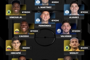 前锋:维尼修斯(巴西、皇马、1.5亿欧)、劳塔罗(阿根廷、国米、8500万欧)、阿尔瓦雷斯(阿根廷、马竞、9000万欧)