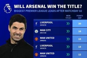 体育资讯4月11日讯 阿森纳在本轮英超爆冷主场1-2不敌伯恩茅斯,当前仍然领先曼城9分。《转会市场》统计显示,英超历史在32轮后领先9分球队全部最终夺冠。但需要注意的是曼城当前少赛2场。