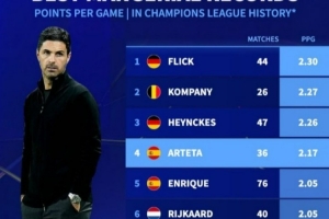 体育资讯4月16日讯 在欧冠淘汰赛次回合,阿森纳0-0战平葡体,总比分1-0晋级。以下为欧冠历史主帅场均积分榜(至少执教25场):