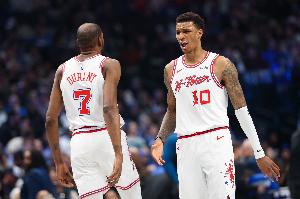首节比赛,火箭进攻端靠杜兰特和小贾巴里·史密斯撑起了,二人内外线都很高效,其中杜兰特7中5(三分2中2)拿到12分1篮板1盖帽;小贾巴里·史密斯4中4(三分2中2)拿到10分1篮板1助攻。